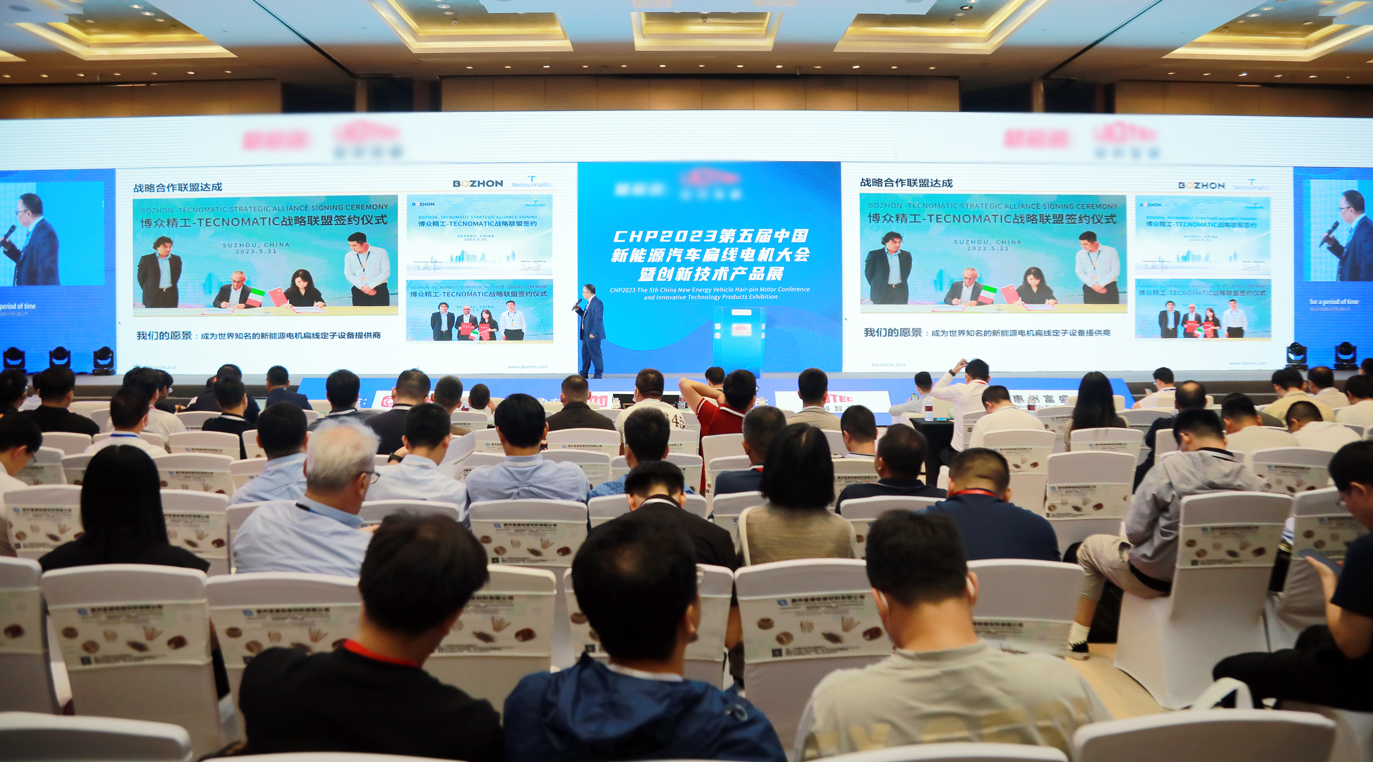 6月20-21日,CHP2023第五屆中國新能源汽車扁線電機(jī)大會(huì)暨創(chuàng)新技術(shù)產(chǎn)品展,在上海成功舉辦。千余位來自多國的扁線電機(jī)企業(yè)高層、行業(yè)學(xué)者、專家參加本次大會(huì)。博眾精工攜手意大利扁線電機(jī)制造設(shè)備企業(yè)Tecnomatic受邀參加。