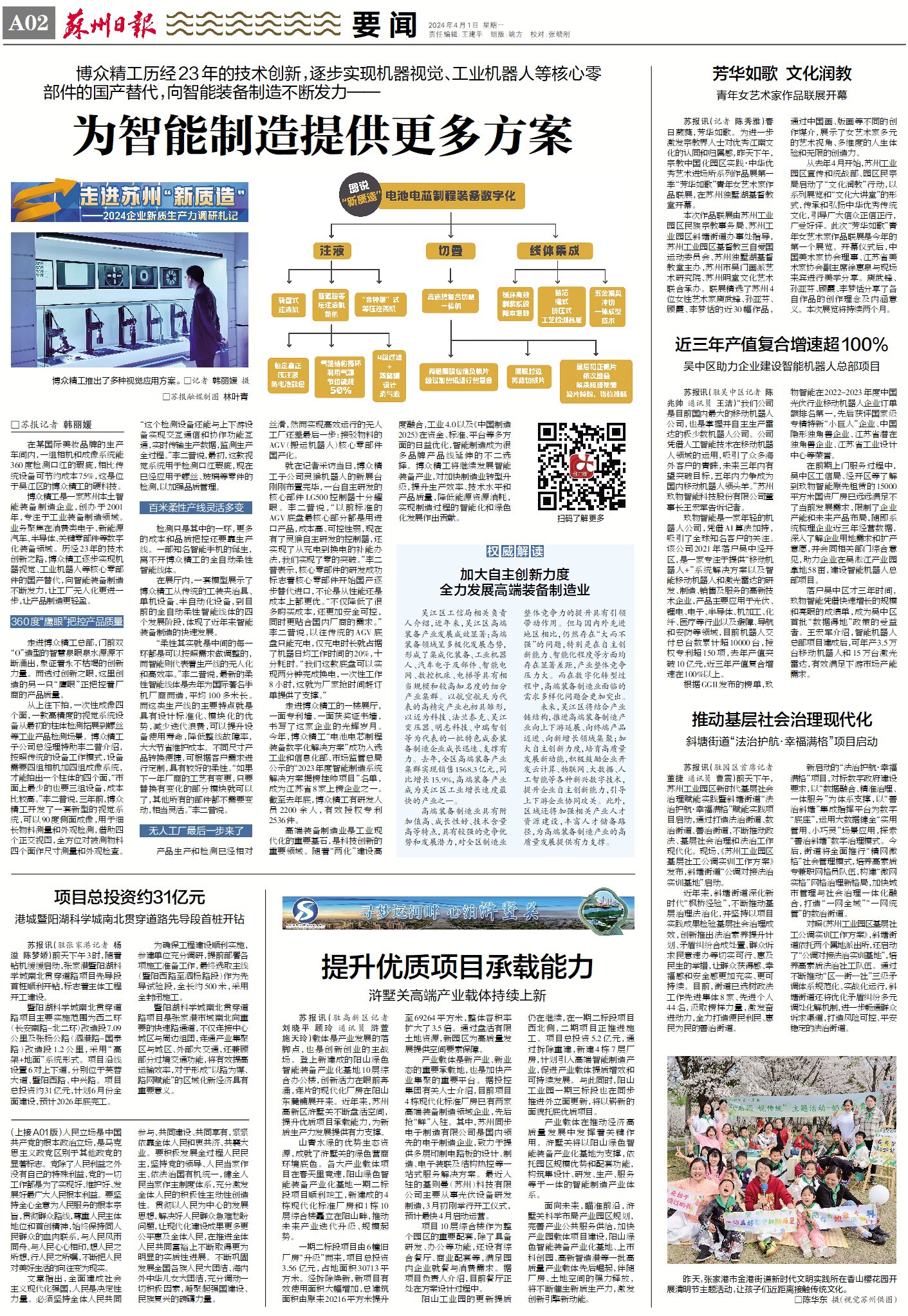 走進(jìn)博眾精工的一樓展廳,一面專(zhuān)利墻、一面獲獎(jiǎng)證書(shū)墻,書(shū)寫(xiě)了這家企業(yè)的光輝歲月。今年,博眾精工“電池電芯制程裝備數(shù)字化解決方案”成功入選工業(yè)和信息化部、市場(chǎng)監(jiān)管總局公示的“2023年度智能制造系統(tǒng)解決方案揭榜掛帥項(xiàng)目”名單,成為江蘇省8家上榜企業(yè)之一。截至去年底,博眾精工有研發(fā)人員2200余人,有效授權(quán)專(zhuān)利2536件。