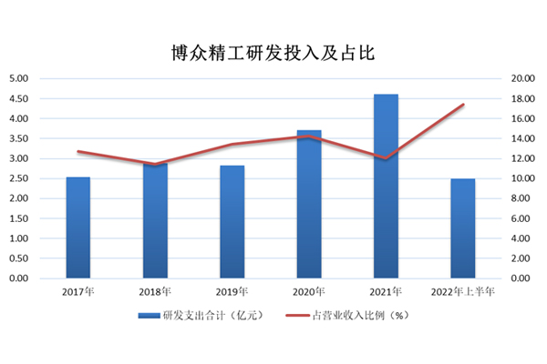 作為技術驅動型企業(yè),博眾精工多年來不惜重金投入研發(fā)。2021年,公司研發(fā)投入4.62億元,研發(fā)投入占營業(yè)收入比例為12.07%。今年上半年,公司研發(fā)投入2.50億元,研發(fā)投入占營業(yè)收入比例為17.45%。日前,由江蘇省工商聯與省科學技術發(fā)展戰(zhàn)略研究院聯合發(fā)布了“2022江蘇民營企業(yè)創(chuàng)新100強”,博眾精工(688097)位列蘇州第四、全省第十。據了解,創(chuàng)新100強企業(yè),2021年度研發(fā)投入占比達3.7%,而博眾精工顯著高于這一水準。